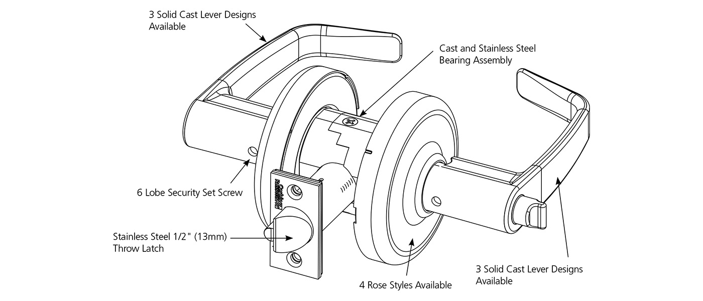 The CL3100 series is a Grade 1 lever lockset manufactured with the highest quality materials to ensure strength, durability and quiet operation. Available in all standard architectural finishes, the CL3100 series subtly complements any high-use commercial, industrial and institutional application.